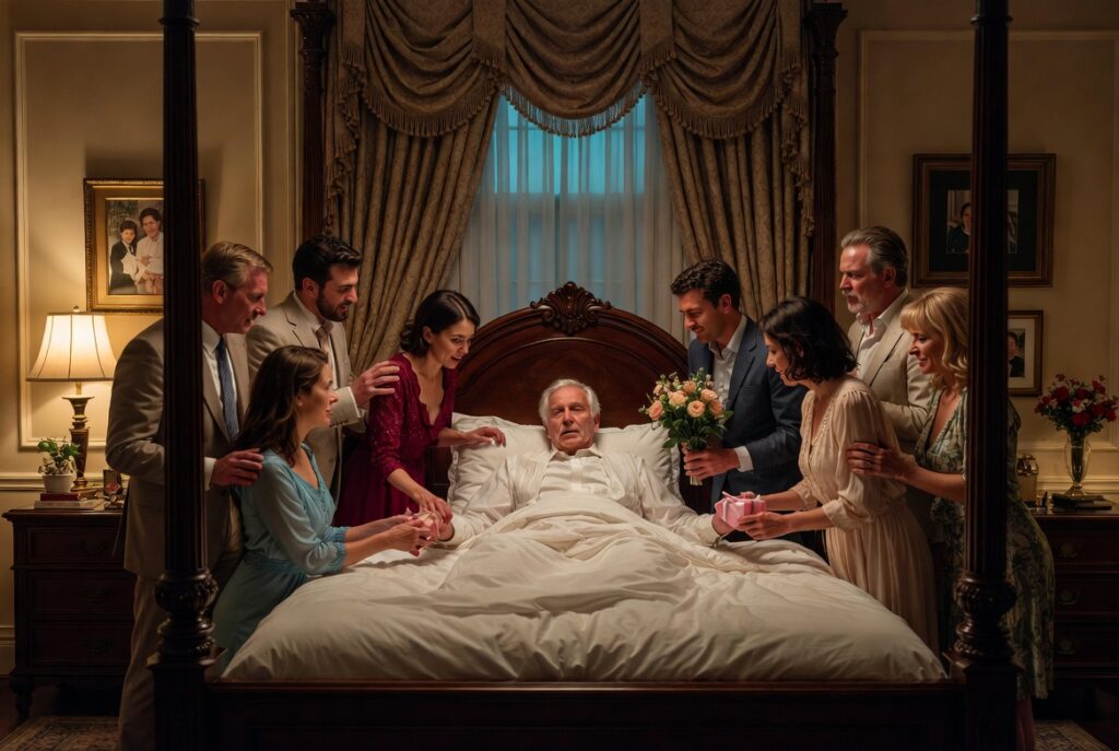 They brought him tea, asked how he felt, and stayed close by… but it all felt forced. Behind their smiles was one goal: the inheritance.
